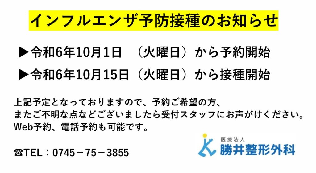 インフルエンザ予防接種についてのお知らせ 2024-09-23 / 新着情報 令和6年10月1日からインフルエンザワクチン予防接種の予約を開始します。 インフルエンザワクチン予防接種をご希望の方は随時受付までお申し出ください。 ご不明な点がございましたら、ご連絡くださいますようお願い申し上げます。(0745-75-3855)