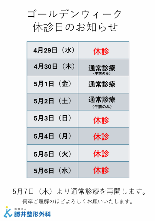 ゴールデンウィーク休診日の知らせ 2026-04-19 / 新着情報 ゴールデンウィークはカレンダー通りのスケジュールで診療を行います。 5月7日(木曜日)より通常診療を再開いたします。 何卒ご理解のほどよろしくお願いいたします。